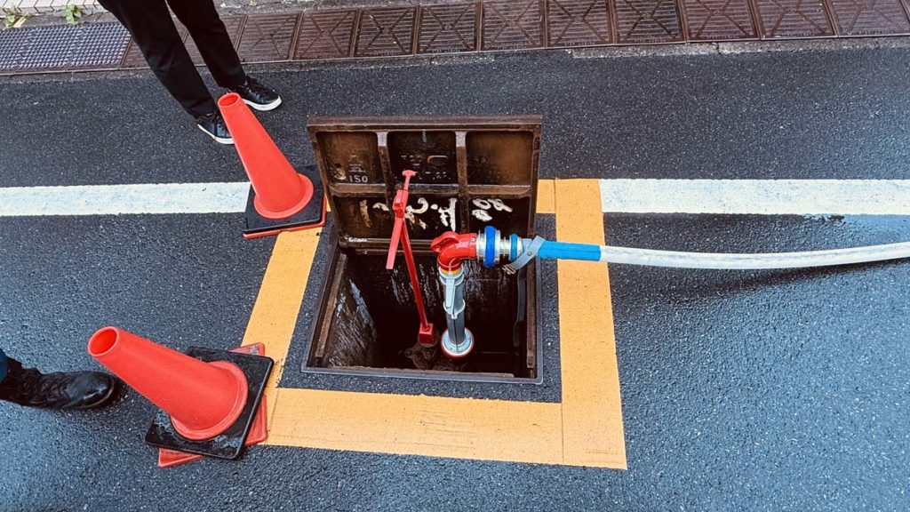 仕組みは意外と単純で、水道管にスタンドパイプをつなぎ「開く」と水が出る。庭の水まきの為の散水と原理は同じだ。ただデカい。この日は体験という事もあり、元口を絞り水圧を調整していたというが、結構な水量と水圧があった。少しづつ水圧を上げないと筒先を持っていかれる感触が残る。手元で放水の開き具合を調整でき、開くと水が拡散し、絞ると遠くまで水が放水される。貴重な体験をさせてもらった。ちなみに荻窪消防団は団員を募集中との事です。