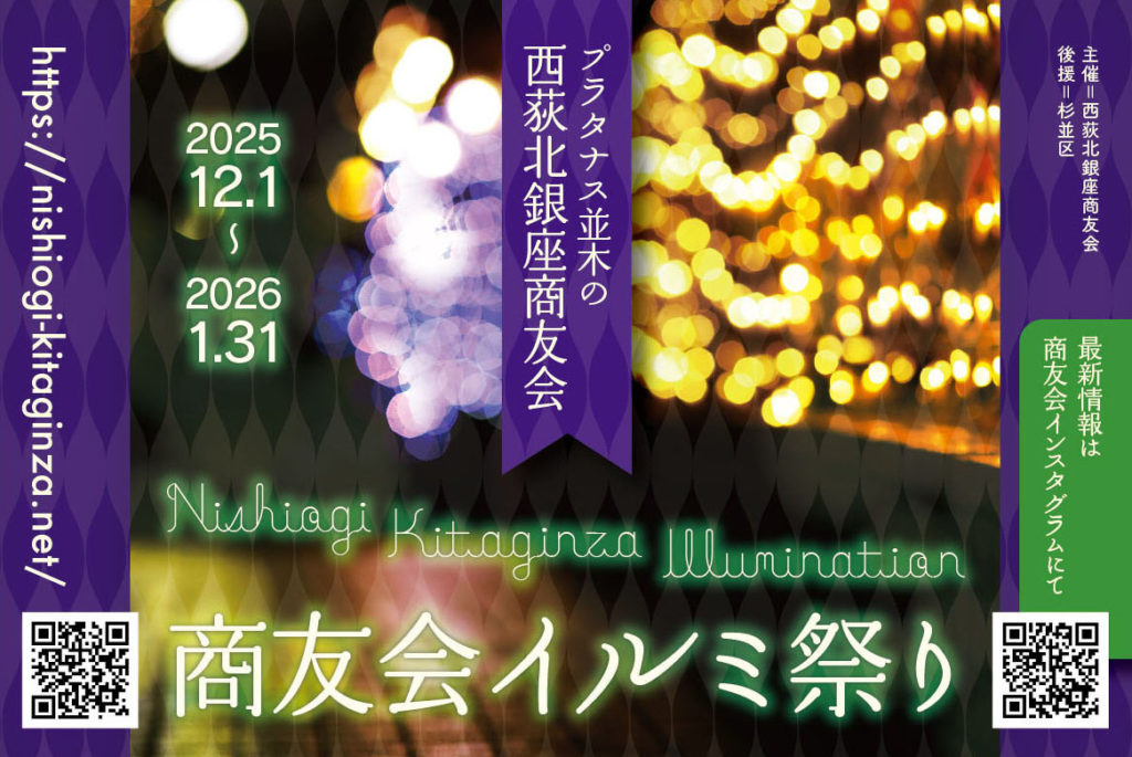 補助132号線こと、北銀座通りにある商店会、「西荻北銀座商友会」では、先日報告した「ハロウィン」の次に、12月〜翌年1月の2ヶ月間、「商友会イルミ祭り」を開催しています。